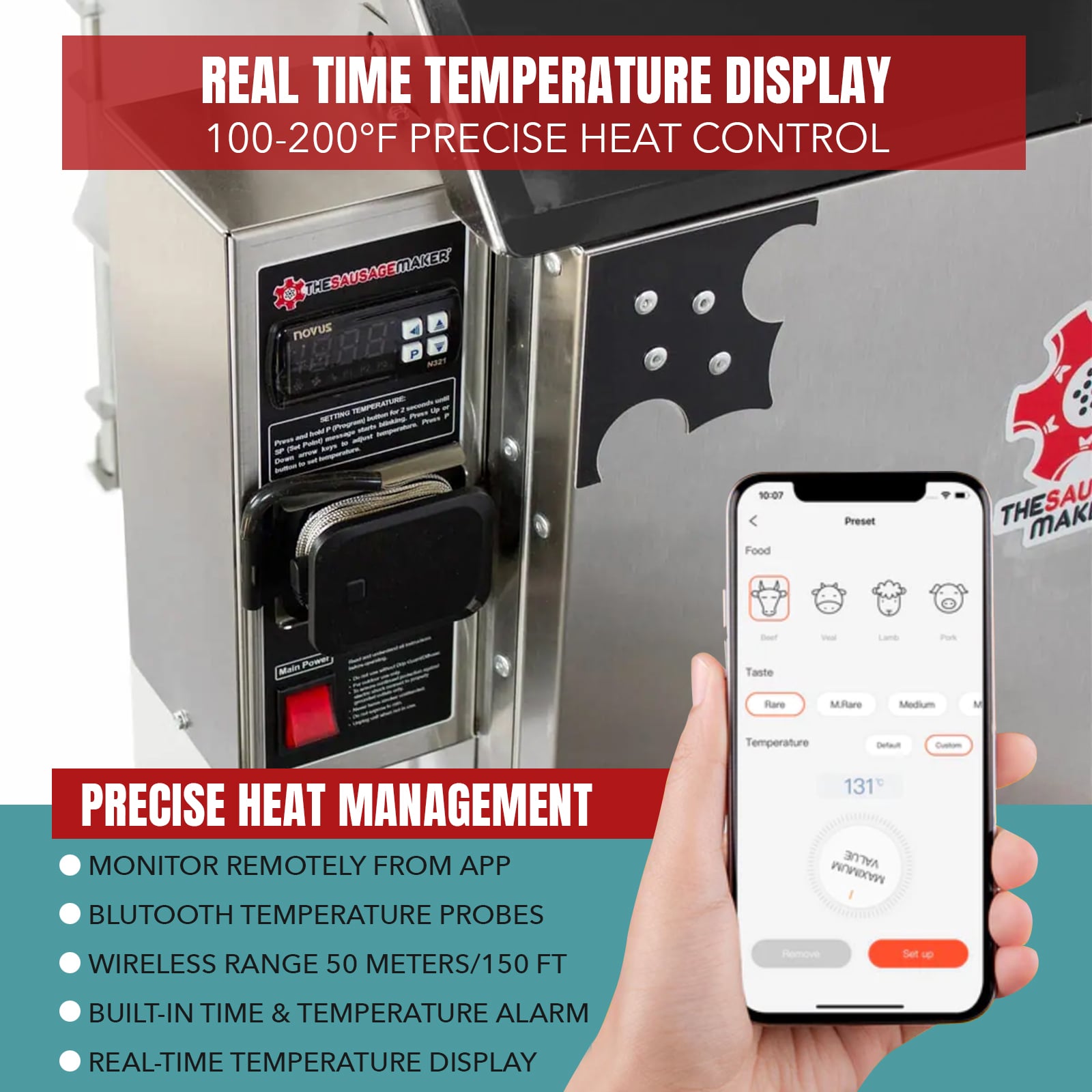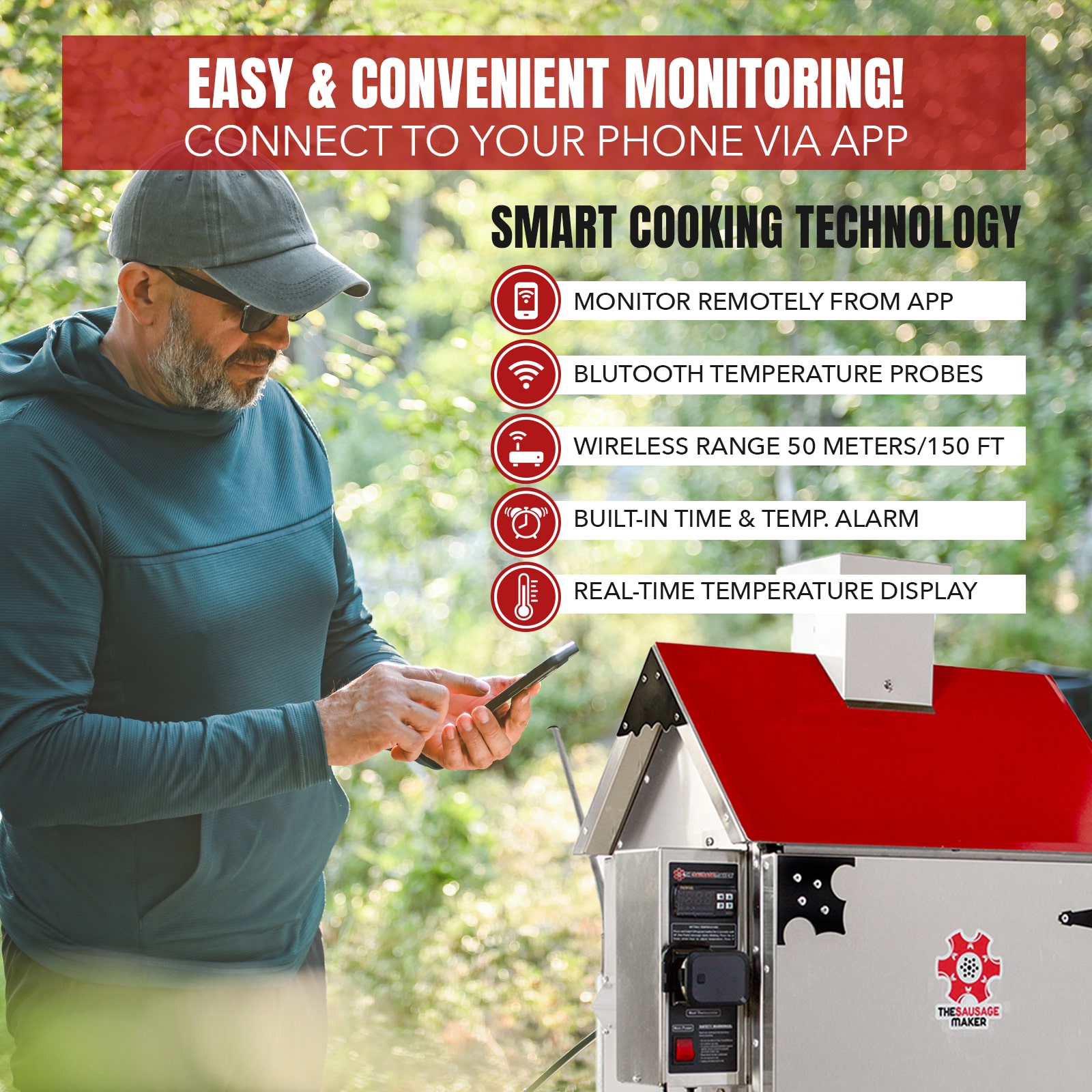 Take convenience to the next level with our Bluetooth electric smoker. The included Smart Cooking Thermometer connects to your smartphone, allowing you to monitor the temperature remotely. The app includes real-time tracking, temperature alarms, and a built-in timer, making it one of the most user-friendly smokers on the market.