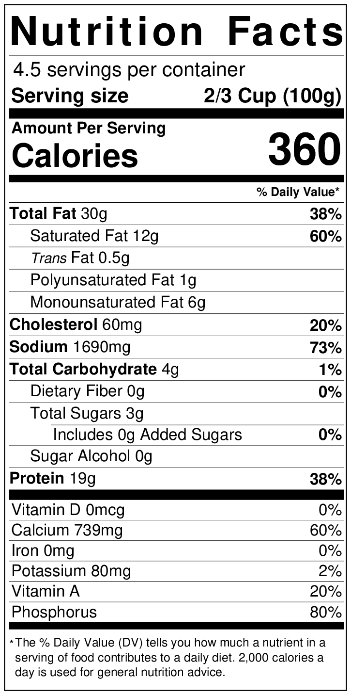 Our cheese also comes in 1 lb. and 5 lb., bags. We have the following types available: Bleu Cheese, Mozzarella, Pepper Jack, and Swiss.