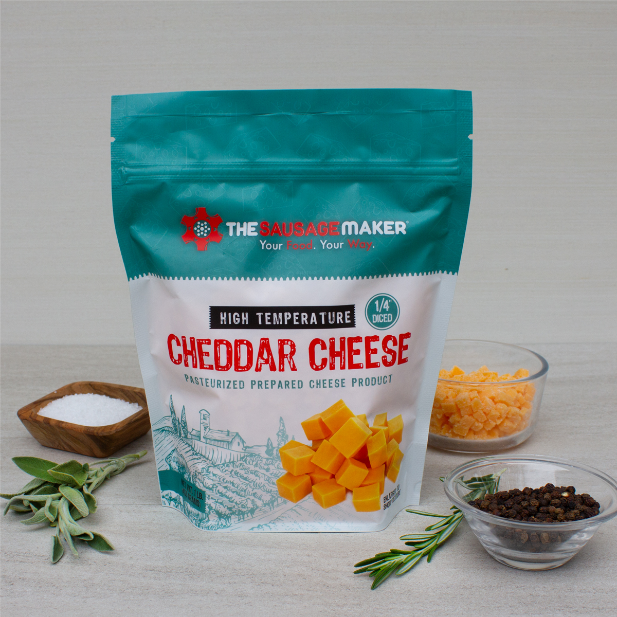 High Temp Cheddar Cheese 1 lb. is made specifically to withstand smoking and grilling temperatures up to 400°F. High temperature cheese is specially made so that it will not melt when cooked under normal smokehouse temperatures. High Temp Cheese gives a creamy flavor to your sausage products.