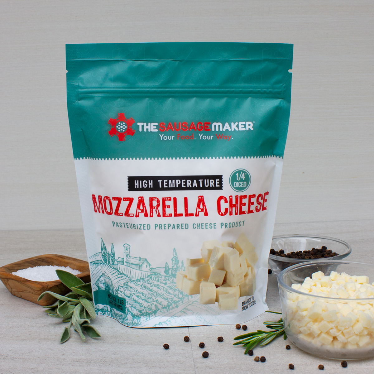 Our High Temp Mozzarella Cheese 1 lbs. is made specifically to withstand smoking and grilling temperatures up to 400°F. High temperature cheese is specially made so that it will not melt when cooked under normal smokehouse temperatures. High Temp Cheese gives a creamy flavor to your sausage products.