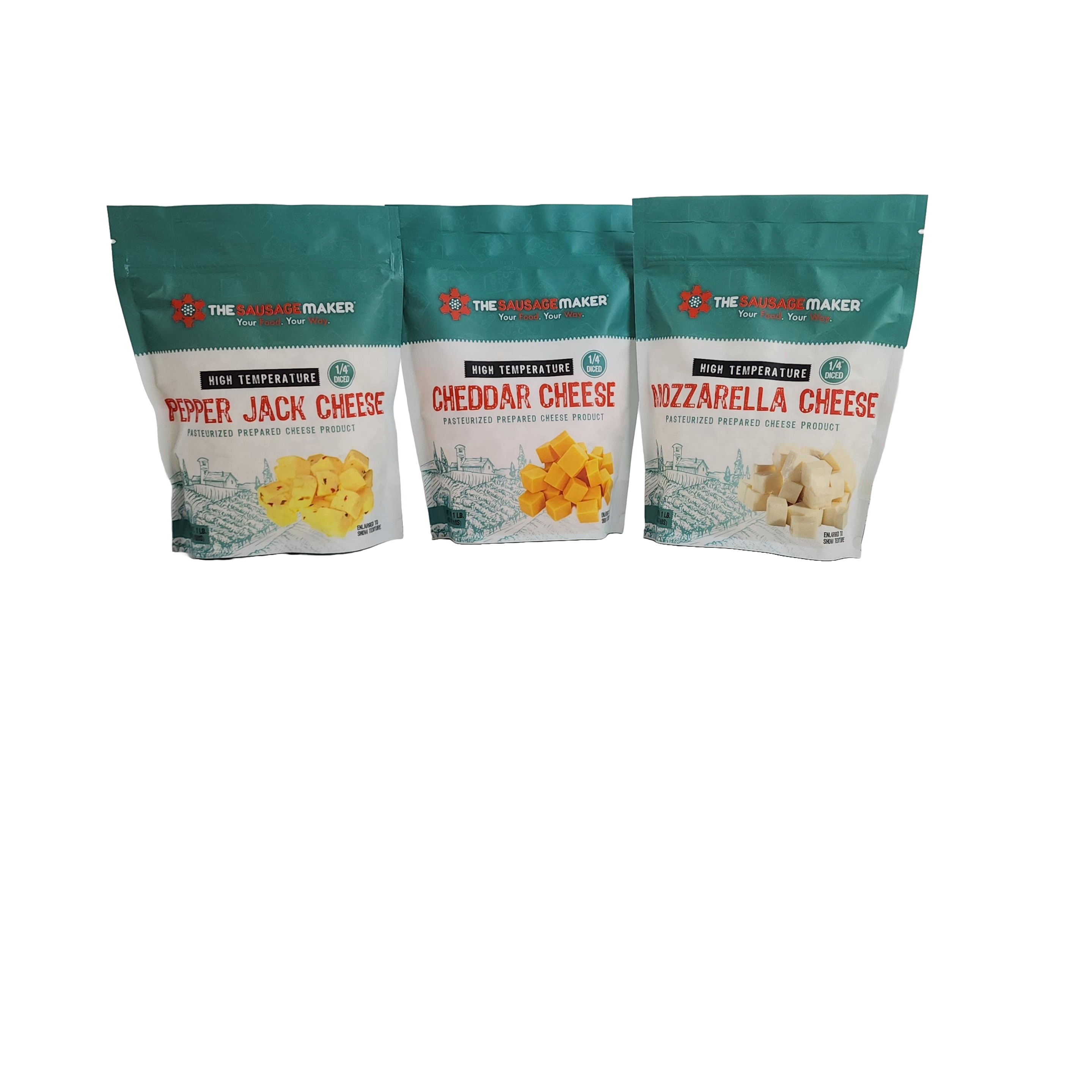 Our High Temp Cheese Assortment comes with l lbs. each of Cheddar, Pepper & Mozzarella. This cheese is specially made with a 400 F melting point so that it doesn’t melt as normal cheese does; it’s perfect for use in a variety of high temperature applications such as injecting into sausages, hot dogs, etc.