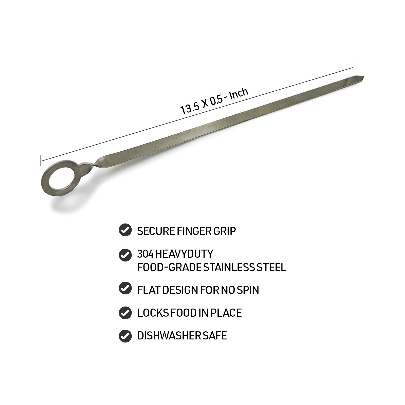 Included are six flat, pointed stainless steel skewers that won’t let your food spin, but securely rest nice and snug. Your tomatoes, onions, and steak chunks will finally stop doing that annoying carousel routine that turns one side burnt and leaves the other questionable. The flat-round handles are comfortable in the hand, very easy to handle.