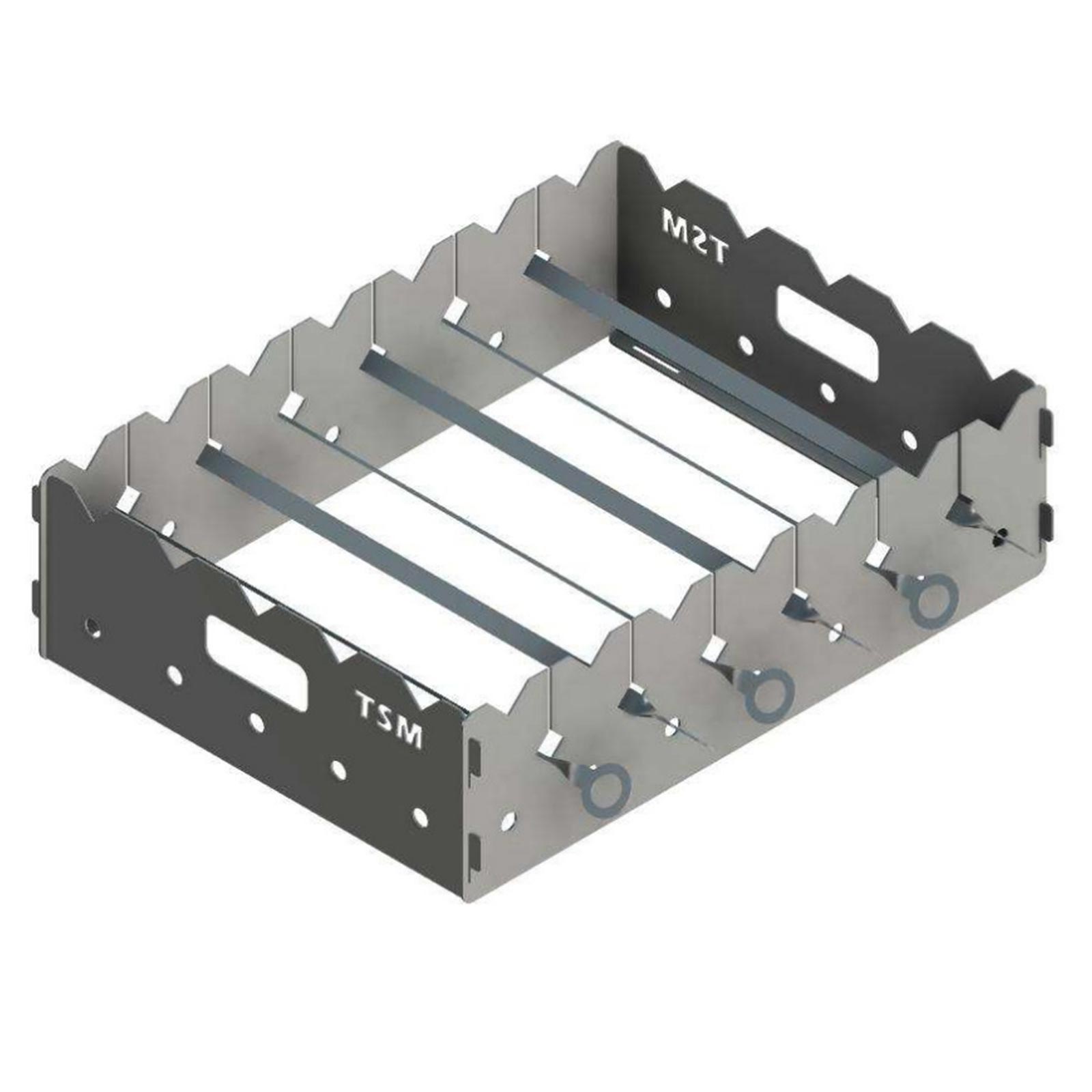 Two opposing sides of the holder have comfortable handle slots, cut out for confident carrying. Bottom slots are cut to custom-fit and lock perfectly into the TSM Portable Toolbox Grill, but just as well can be used on just about any grill.