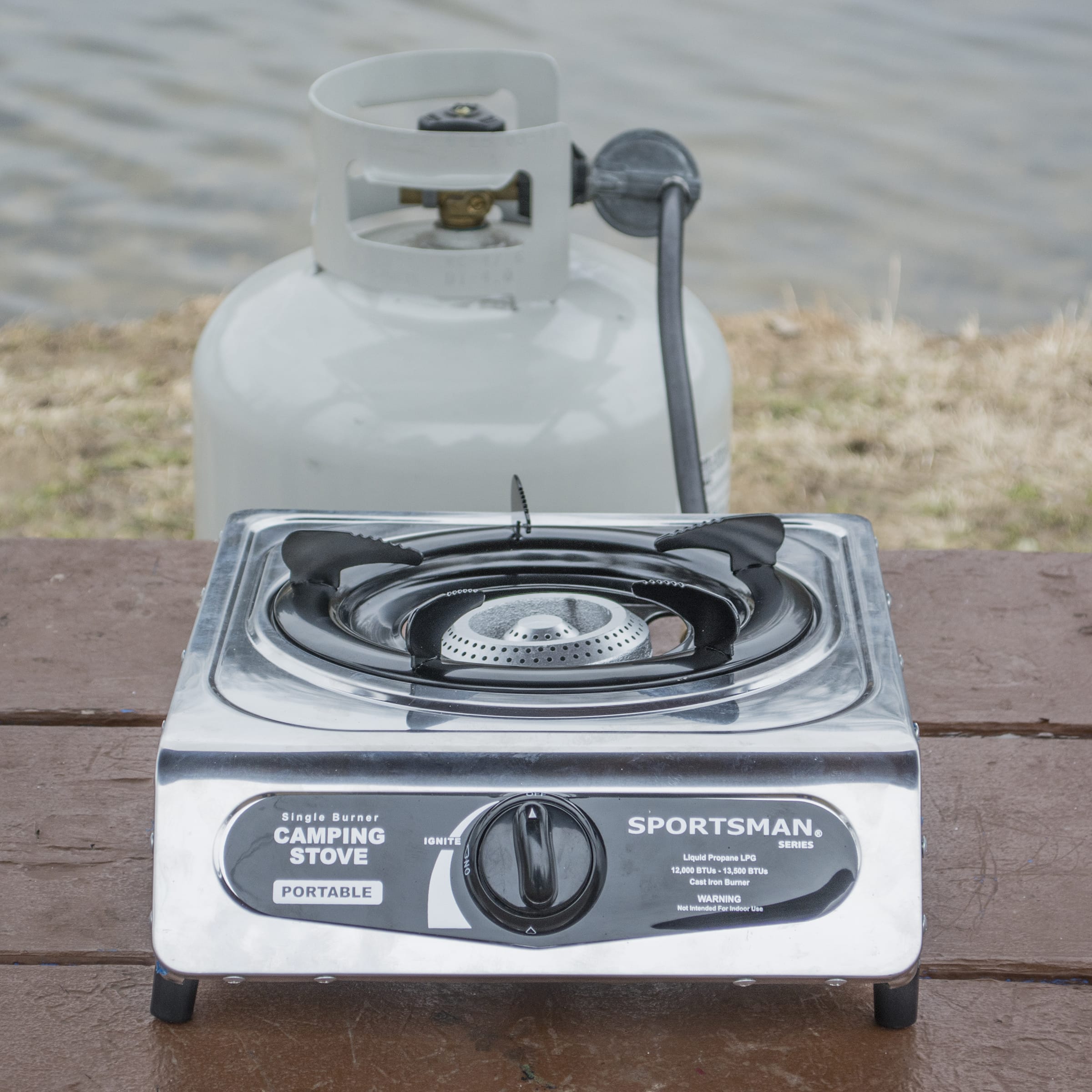 It weighs only 1.5 pounds making it easy to move and set up just about anywhere. Hook the stove up to an LP tank for an adjustable flame of 12,000 to 13,500 BTUs. The auto ignite feature lights the flame so you don’t have to. There is no limit to the hearty meals you can serve up with this Single single-burner adjustable Camping Stove.